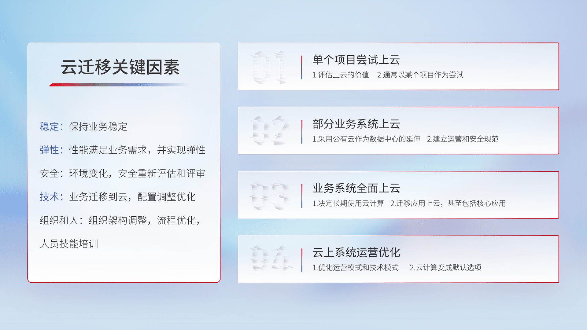 结合实际业务,,,,从规划设计、、云平台选型、、云原生改造、、、数据迁移、、集成交付,,,,迁移全过程为客户识别最佳上云路径,,,做好风险识别管理,,设计网络架构、、、身份权限、、、、安全审计合规、、、操作审计、、、日志审计、、、监控告警策略、、、、多站点容灾设计等,,,,对云上基础设施进行整体规划,,提升IT治理水平,,以满足弹性、、、、高可用、、、、高性能的需求。。。